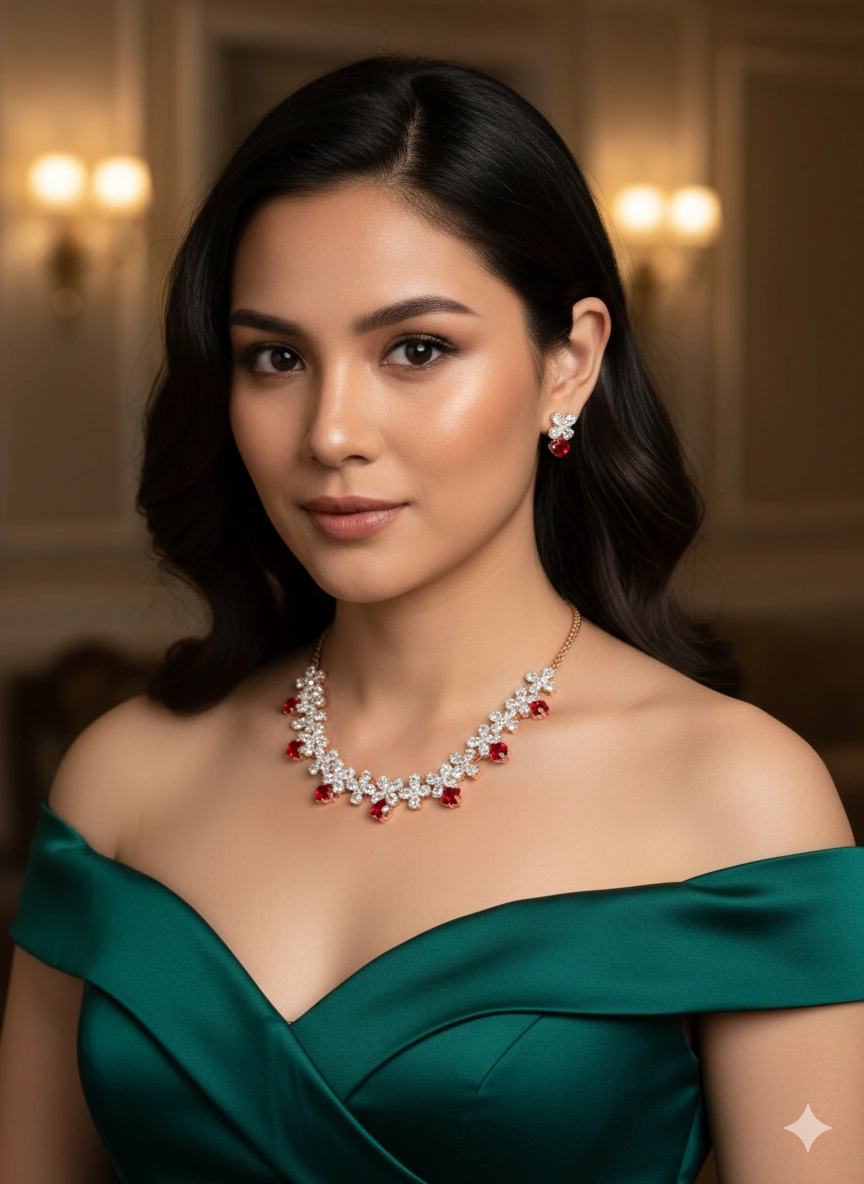Suitable for festive events, traditional gatherings, and special occasions, this necklace set delivers decorative detailing, symmetrical placement, and coordinated accessory styling within an accessible price segment.