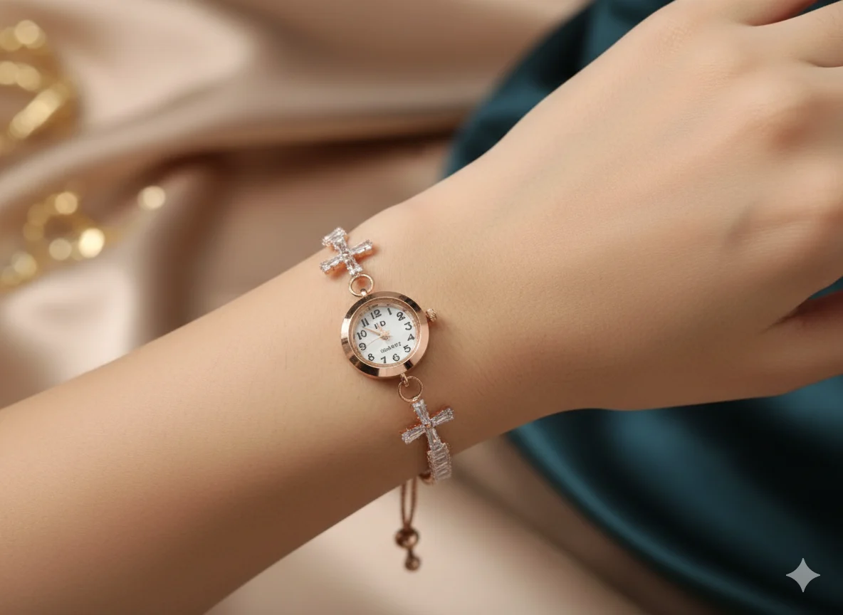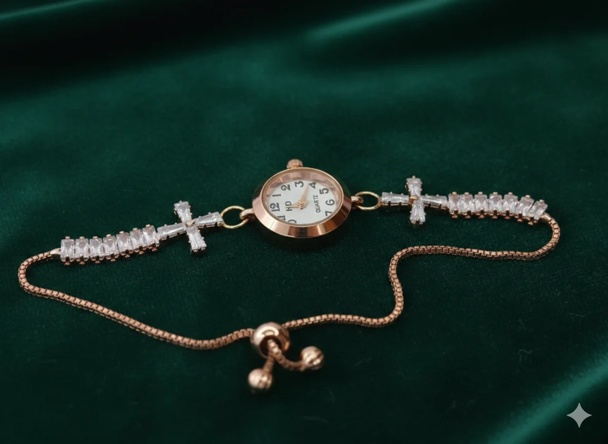 This bracelet watch features a round analog dial connected with decorative crystal-accented segments, creating a jewellery-inspired wrist accessory. The rose gold tone finish enhances its refined appearance while maintaining a slim wrist profile.
